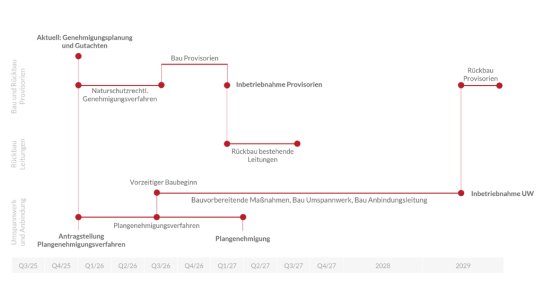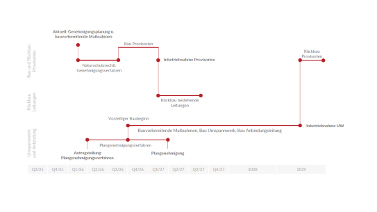 - Im Anschluss wird das neue 110-kV-Umspannwerk errichtet und in Betrieb genommen.